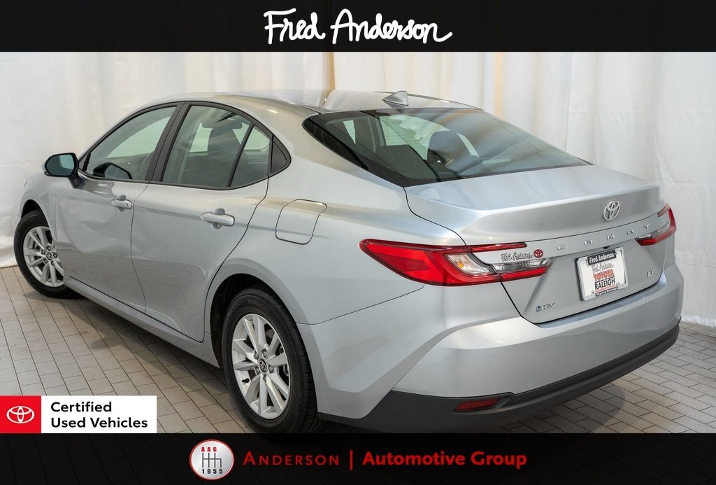 CARFAX One-Owner. Clean CARFAX. Priced below KBB Fair Purchase Price! *Full Family Plan* INCLUDES OIL CHANGES FOR LIFE!, Still Under Factory Powertrain Warranty!!, Only One Owner and Accident Free Carfax!!, Alloy wheels / Premium Wheels, Bluetooth, Hands-Free, Star Safety System with Active Breaking Technologies, Keyless Entry, Keyless Start, Backup Camera, We will buy your car and pay top dollar for it, even if you don't buy ours!!, USB Port, 2.5L 4-Cylinder 16V DOHC, Black w/Fabric Seat Trim, ABS brakes, Active Cruise Control, Alloy wheels, Electronic Stability Control, Front dual zone A/C, Heated door mirrors, Illuminated entry, Low tire pressure warning, Remote keyless entry, Traction control. Check out all these great options Toyota Gold Certified Certified, 2.5L 4-Cylinder 16V DOHC, Black w/Fabric Seat Trim, ABS brakes, Active Cruise Control, Alloy wheels, Electronic Stability Control, Front dual zone A/C, Heated door mirrors, Illuminated entry, Low tire pressure warning, Remote keyless entry, Traction control, 4-Wheel Disc Brakes, 6 Speakers, Air Conditioning, AM/FM radio: SiriusXM, Apple CarPlay/Android Auto, Auto High-beam Headlights, Automatic temperature control, Brake assist, Bumpers: body-color, Delay-off headlights, Driver door bin, Driver vanity mirror, Dual front impact airbags, Dual front side impact airbags, Emergency communication system: Safety Connect (up to 10-year trial subscription), Exterior Parking Camera Rear, Fabric Seat Trim, Four wheel independent suspension, Front anti-roll bar, Front Bucket Seats, Front Center Armrest, Front reading lights, Fully automatic headlights, Knee airbag, Occupant sensing airbag, Outside temperature display, Overhead airbag, Overhead console, Panic alarm, Passenger door bin, Passenger vanity mirror, Power door mirrors, Power steering, Power windows, Radio data system, Radio: Toyota Audio Multimedia w/8" Touchscreen, Rear anti-roll bar, Rear seat center armrest, Rear side impact airbag, Rear window defroster, Security system, Speed control, Speed-sensing steering, Split folding rear seat, Steering wheel mounted audio controls, Telescoping steering wheel, Tilt steering wheel, Trip computer, Turn signal indicator mirrors, Variably intermittent wipers, and Wheels: 16" Silver-Finished AlloyStop by and test drive today. Let us show you how affordable we can make it. Remember, we always give you more for your trade and we will buy your vehicle even if you don't buy one from us. See online @ www.FredAndersonToyota.com or see in person @ Fred Anderson Toyota 9101 Glenwood Ave. Raleigh NC, 27617. Recent Arrival! 2025 Toyota Certified. Camry LE FWD Celestial Silver Metallic eCVT