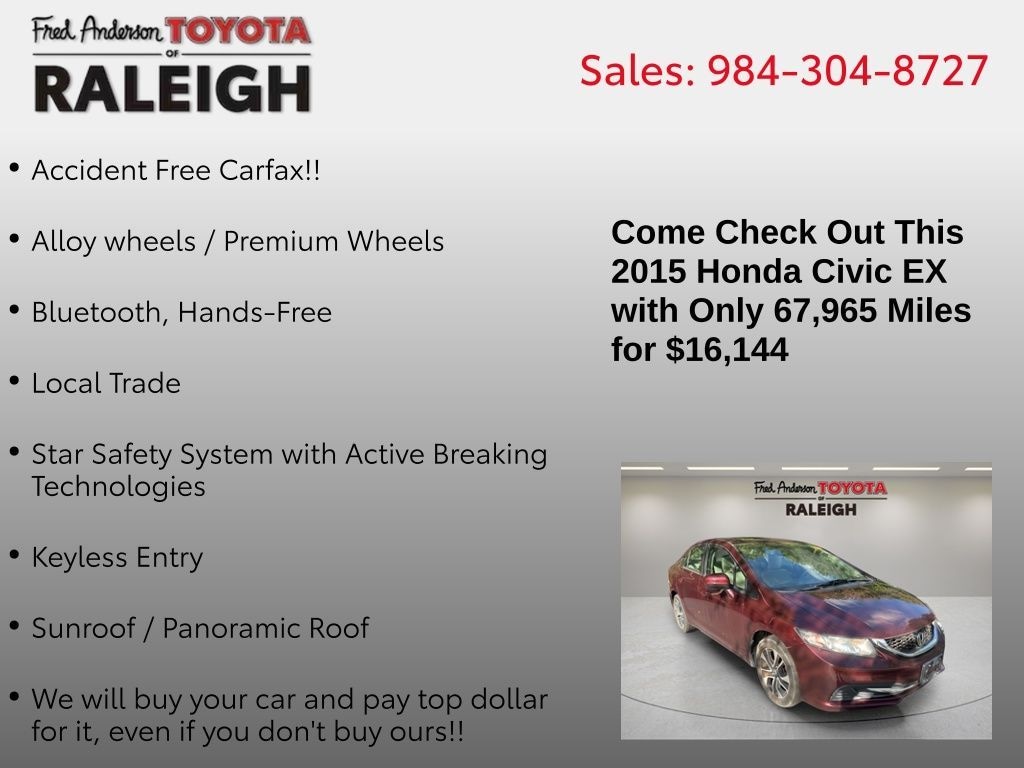 Clean CARFAX. Accident Free Carfax!!, Alloy wheels / Premium Wheels, Bluetooth, Hands-Free, Local Trade, Star Safety System with Active Breaking Technologies, Keyless Entry, Sunroof / Panoramic Roof, We will buy your car and pay top dollar for it, even if you don't buy ours!!, Gray w/Cloth Seat Trim. Odometer is 49928 miles below market average! Check out all these great options Gray w/Cloth Seat Trim, 16" Alloy Wheels, 160-Watt AM/FM/CD Audio System, 4-Wheel Disc Brakes, 6 Speakers, ABS brakes, Air Conditioning, Alloy wheels, AM/FM radio, Automatic temperature control, Brake assist, Bumpers: body-color, CD player, Cloth Seat Trim, Delay-off headlights, Driver door bin, Driver vanity mirror, Dual front impact airbags, Dual front side impact airbags, Electronic Stability Control, Exterior Parking Camera Rear, Four wheel independent suspension, Front anti-roll bar, Front Bucket Seats, Front Center Armrest, Front reading lights, Fully automatic headlights, Illuminated entry, Low tire pressure warning, Occupant sensing airbag, Outside temperature display, Overhead airbag, Panic alarm, Passenger door bin, Passenger vanity mirror, Power door mirrors, Power moonroof, Power steering, Power windows, Radio data system, Rear anti-roll bar, Rear seat center armrest, Rear window defroster, Reclining Front Bucket Seats, Remote keyless entry, Security system, Speed control, Speed-sensing steering, Split folding rear seat, Steering wheel mounted audio controls, Tachometer, Telescoping steering wheel, Tilt steering wheel, Traction control, Trip computer, and Variably intermittent wipersStop by and test drive today. Let us show you how affordable we can make it. Remember, we always give you more for your trade and we will buy your vehicle even if you don't buy one from us. See online @ www.FredAndersonToyota.com or see in person @ Fred Anderson Toyota 9101 Glenwood Ave. Raleigh NC, 27617. 2015 Honda Civic EX FWD Crimson Pearl CVT