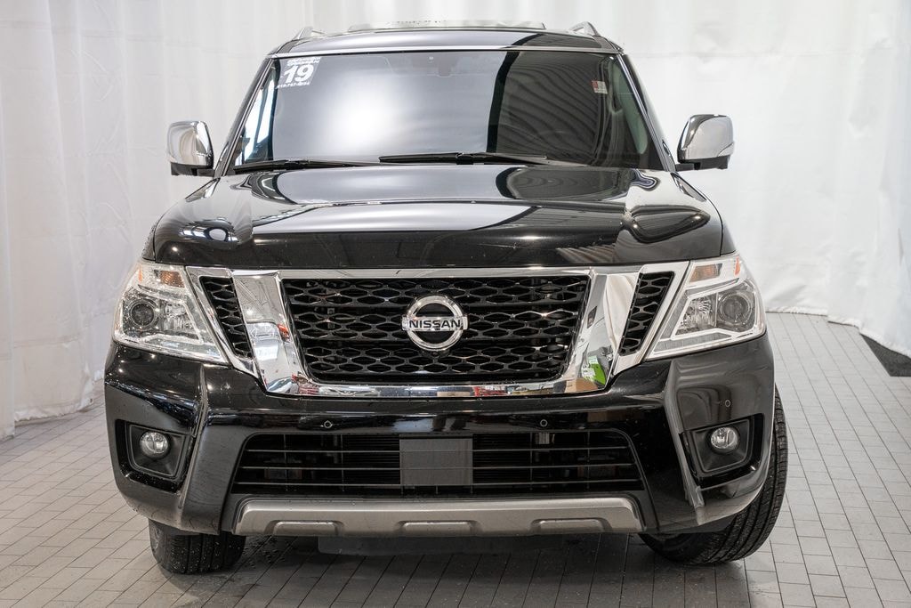 Check out all these great options Captain's Chairs Package (2nd Row Captain's Chairs and 2nd Row Center Console w/ Padded Armrest), Cargo Package, Carpeted Floor Mats w/ Captain Seat Package, Interior Lighting Package, 13 Speakers, 2.937 Axle Ratio, 3rd row seats: split-bench, 4-Wheel Disc Brakes, A/V remote, ABS brakes, Air Conditioning, Alloy wheels, AM/FM radio: SiriusXM, Anti-whiplash front head restraints, Auto tilt-away steering wheel, Auto-dimming door mirrors, Auto-dimming Rear-View mirror, Auto-leveling suspension, Automatic temperature control, Brake assist, Bumpers: body-color, CD player, Delay-off headlights, Driver door bin, Driver vanity mirror, Dual front impact airbags, Dual front side impact airbags, Electronic Stability Control, Emergency communication system: NissanConnect Services, Four wheel independent suspension, Front anti-roll bar, Front Bucket Seats, Front Center Armrest, Front dual zone A/C, Front fog lights, Front reading lights, Fully automatic headlights, Garage door transmitter: HomeLink, Headphones, Heated & Cooled Front Bucket Seats w/Driver Memory, Heated door mirrors, Heated front seats, Heated rear seats, Heated steering wheel, Illuminated entry, Leather Shift Knob, Leather-Appointed Seat Trim, Low tire pressure warning, Memory seat, Navigation System, Occupant sensing airbag, Outside temperature display, Overhead airbag, Overhead console, Panic alarm, Passenger door bin, Passenger vanity mirror, Power door mirrors, Power driver seat, Power Liftgate, Power moonroof, Power passenger seat, Power steering, Power windows, Radio data system, Radio: AM/FM/SXM/CD/MP3/HD, Rain sensing wipers, Rear air conditioning, Rear anti-roll bar, Rear reading lights, Rear seat center armrest, Rear window defroster, Rear window wiper, Reclining 3rd row seat, Remote keyless entry, Roof rack: rails only, Security system, Speed control, Speed-sensing steering, Speed-Sensitive Wipers, Split folding rear seat, Spoiler, Steering wheel memory, Steering wheel mounted audio controls, Tachometer, Telescoping steering wheel, Tilt steering wheel, Traction control, Trip computer, Turn signal indicator mirrors, Variably intermittent wipers, Ventilated front seats, Voltmeter, and Wheels: 20" Machine-Faced Chrome w/Tinted CC *** AVAILABLE AT FRED ANDERSON NISSAN OF RALEIGH. CALL US NOW 919-787-0254*** Nissan Armada Super Black Platinum RWD 7-Speed Automatic 5.6L V8 DOHC 32V Endurance