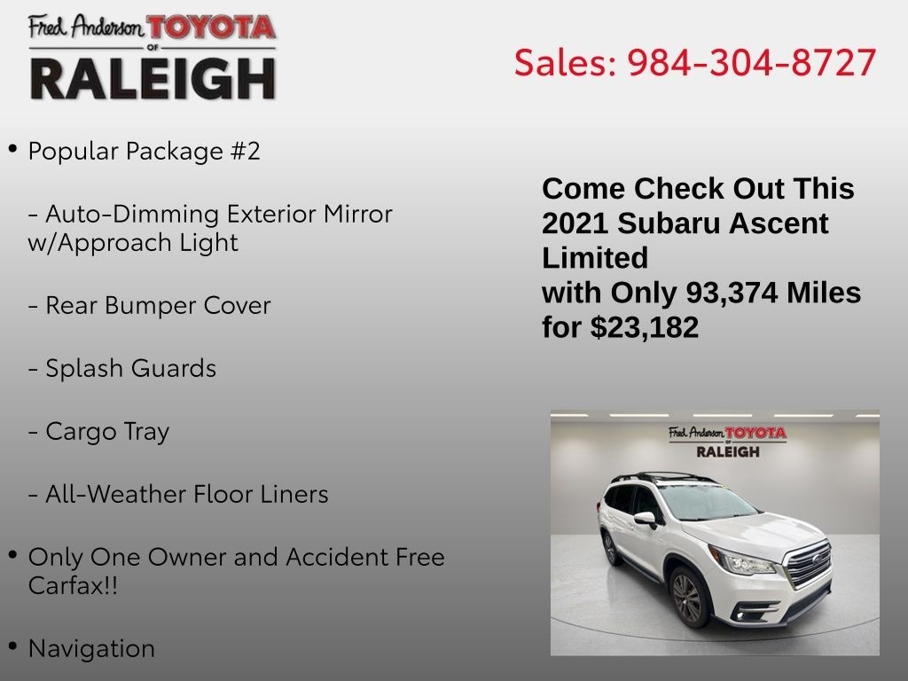 CARFAX One-Owner. Clean CARFAX. Only One Owner and Accident Free Carfax!!, Navigation, Alloy wheels / Premium Wheels, Bluetooth, Hands-Free, Leather Seats, 3rd Row Seats, Local Trade, Star Safety System with Active Breaking Technologies, Keyless Entry, Keyless Start, Backup Camera, Sunroof / Panoramic Roof, We will buy your car and pay top dollar for it, even if you don't buy ours!!, USB Port, All-Weather Floor Liners, Auto-Dimming Exterior Mirror w/Approach Light, Cargo Tray, Navigation System, Popular Package #2, Rear Bumper Cover, Splash Guards. Check out all these great options Popular Package #2 (All-Weather Floor Liners, Auto-Dimming Exterior Mirror w/Approach Light, Cargo Tray, Rear Bumper Cover, and Splash Guards), Technology Package (Cargo Area Cover, Dual Glass Panoramic Power Moonroof, and Radio: Subaru STARLINK 8.0" Multimedia Nav System), Navigation System, 3rd Row Bench Rear Seatback Protector, 3rd row seats: bench, 3rd Row Sunshade, 4-Wheel Disc Brakes, 6 Speakers, ABS brakes, Aero Crossbar Set, Air Conditioning, Alloy wheels, AM/FM radio: SiriusXM, Auto High-beam Headlights, Auto-dimming Rear-View mirror, Automatic temperature control, Axle Ratio: 4.44, Brake assist, Bumpers: body-color, CD player, Compass, Cup Holder Insert, Delay-off headlights, Driver door bin, Driver vanity mirror, Dual front impact airbags, Dual front side impact airbags, Electronic Stability Control, Emergency communication system: STARLINK Safety and Security (Subscription Required), Exterior Parking Camera Rear, Four wheel independent suspension, Front anti-roll bar, Front Bucket Seats, Front Center Armrest, Front dual zone A/C, Front fog lights, Front reading lights, Fully automatic headlights, Garage door transmitter: HomeLink, Heated door mirrors, Heated Front Bucket Seats, Heated front seats, Heated rear seats, Heated steering wheel, Illuminated entry, Knee airbag, Low tire pressure warning, Memory seat, Occupant sensing airbag, Outside temperature display, Overhead airbag, Overhead console, Panic alarm, Passenger door bin, Passenger vanity mirror, Perforated Leather-Trimmed Upholstery, Power door mirrors, Power driver seat, Power Liftgate, Power passenger seat, Power steering, Power windows, Radio data system, Radio: Subaru STARLINK 8.0" Multimedia Plus System, Rear air conditioning, Rear anti-roll bar, Rear reading lights, Rear window defroster, Rear window wiper, Reclining 3rd row seat, Remote keyless entry, Security system, Speed control, Split folding rear seat, Spoiler, STARLINK/Apple CarPlay/Android Auto, Steering wheel mounted audio controls, Tachometer, Telescoping steering wheel, Tilt steering wheel, Traction control, Trip computer, Turn signal indicator mirrors, Variably intermittent wipers, and Wheels: 20" x 7.5 J Dk Gray Alloy w/Machine FinishStop by and test drive today. Let us show you how affordable we can make it. Remember, we always give you more for your trade and we will buy your vehicle even if you don't buy one from us. See online @ www.FredAndersonToyota.com or see in person @ Fred Anderson Toyota 9101 Glenwood Ave. Raleigh NC, 27617. 2021 Subaru Ascent Limited AWD Crystal White Pearl Lineartronic CVT