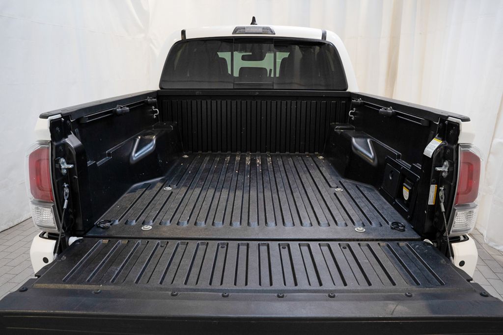 The exterior of the Tacoma TRD Sport exudes a rugged and sporty style, with a bold front grille, LED fog lamps, and a sleek white paint finish that turns heads wherever you go. The interior is equally impressive, with premium features like leather-wrapped steering wheel and shift knob, as well as a premium JBL audio system with navigation and a large 8-inch touchscreen display.
